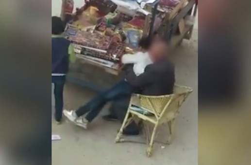 目击者拍摄的现场视频显示,一名身穿蓝衣连衣裙的女孩和一名白衣女孩站在一个卖零食的小摊旁,一绿衣短发女孩被一老人搂在怀里坐在椅子上。