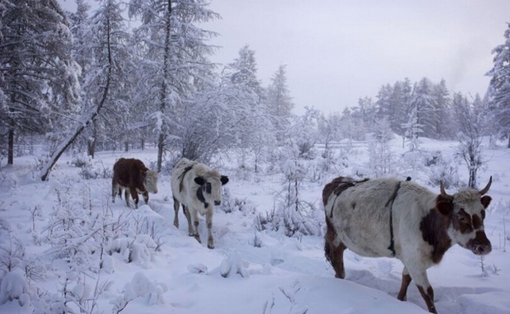 农夫尼古莱-皮特洛维奇把奶牛带到奥伊米娅康村边,让它们喝这里的温泉水。