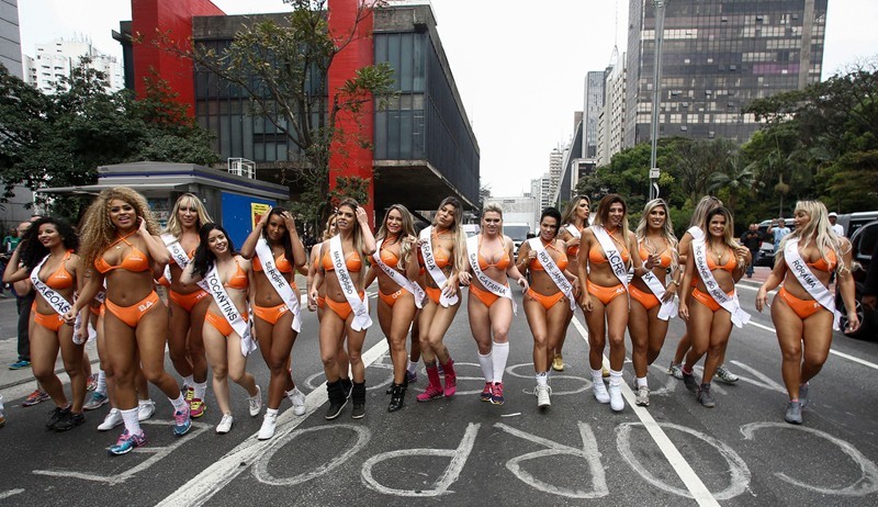 当地时间2016年8月8日,巴西圣保罗,模特们身穿比基尼亮相圣保罗人大道,为2016巴西美臀小姐大赛预热。