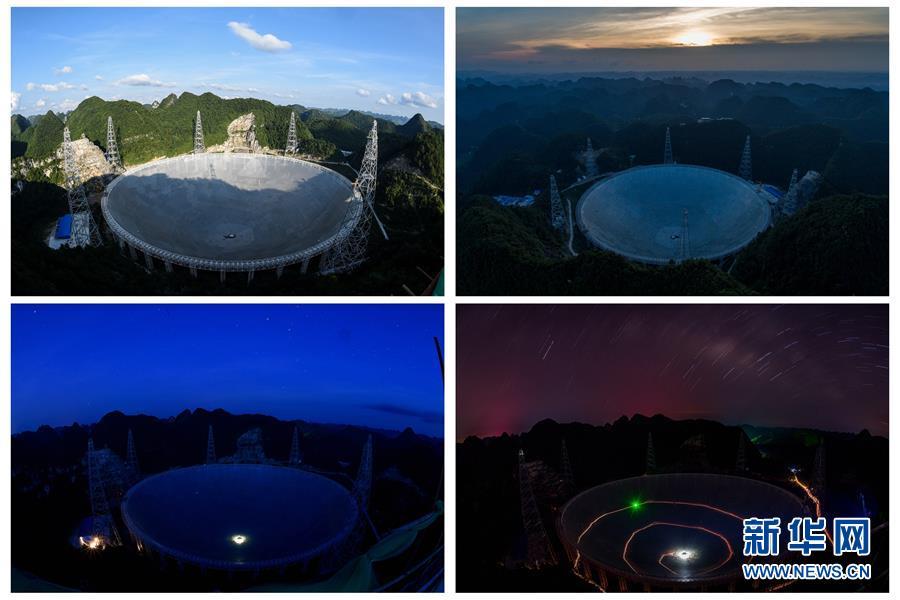 这张拼版照片显示的是500米口径球面射电望远镜(FAST)工程从白天到夜晚的景象变化(6月27日摄)。
