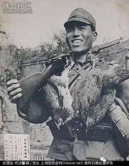 脖子上挂着抢来的两只鸡的日军。