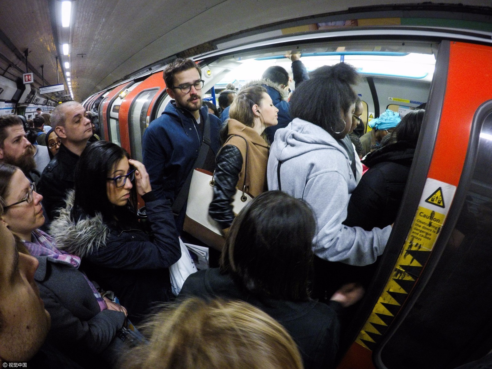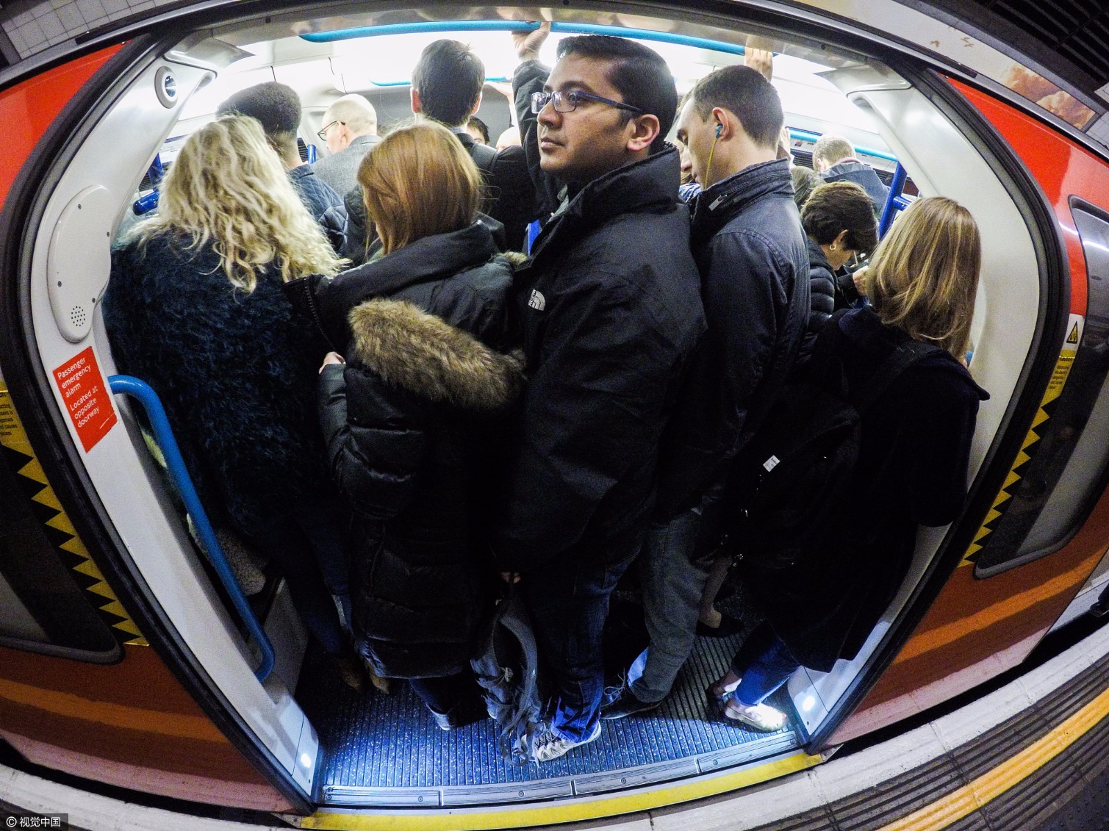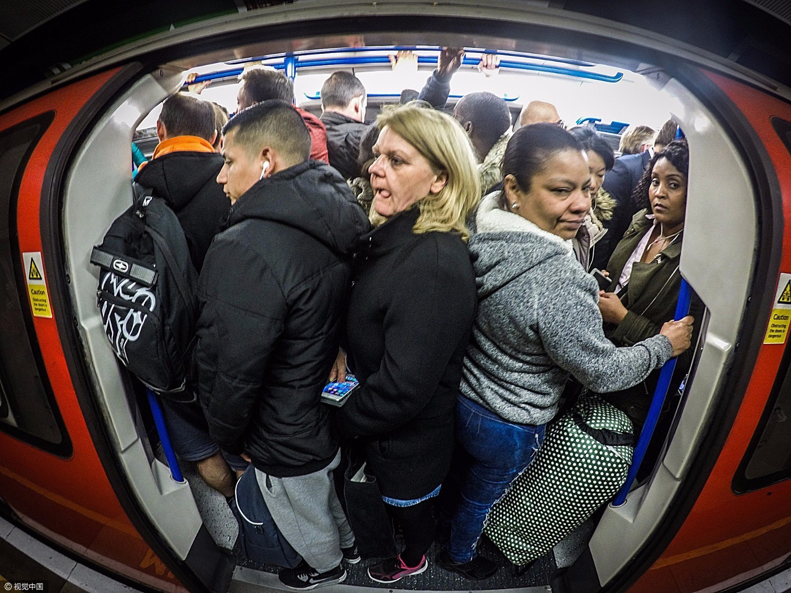 2017年4月18日讯,英国伦敦,高峰时段,地铁中央列车山的通勤者。摄影师拍摄到7至9点早高峰地铁拥挤不堪、摩肩接踵的一幕。