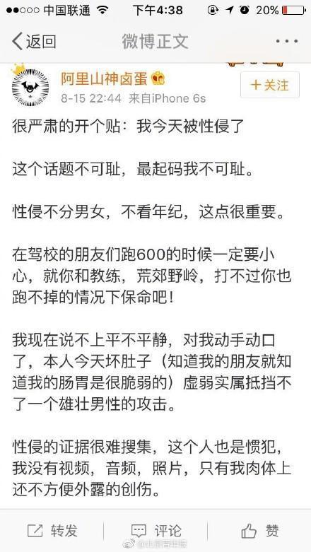 近日,大连一22岁男子(网名“阿里山神卤蛋”)在微博发文称,自己在大连的驾校学车过程中,被一名男性教练性侵并受伤。