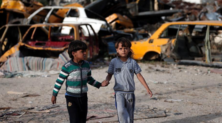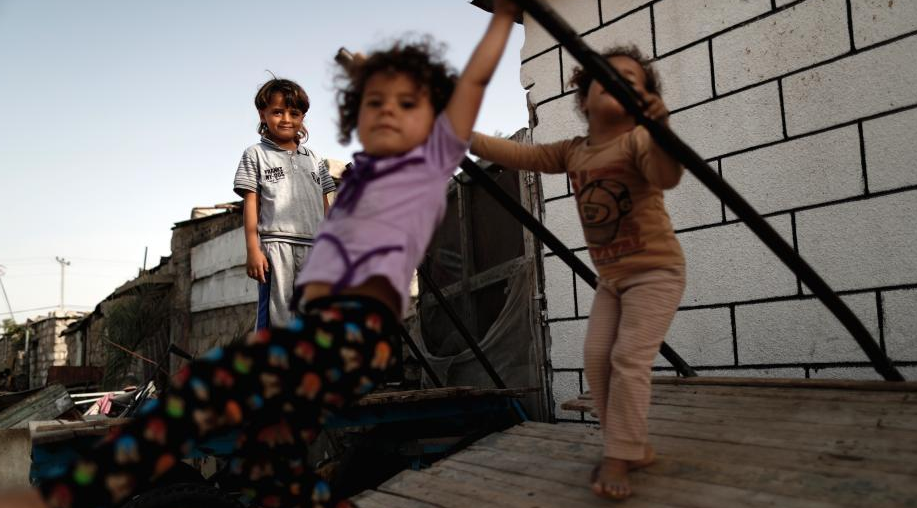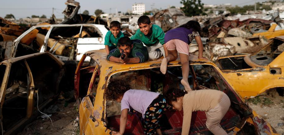当地时间2016年5月9日,加沙地带汗尤尼斯,加沙的巴勒斯坦儿童在废墟间玩耍。