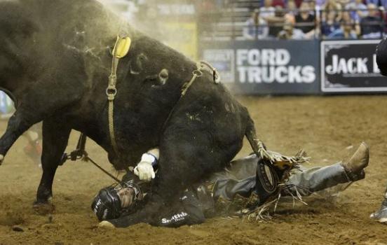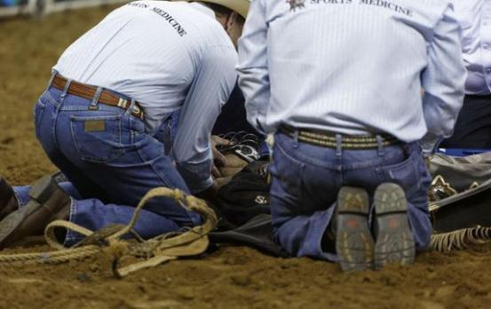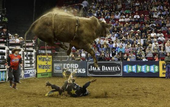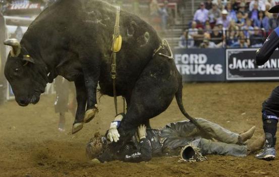 把选手扔下还不算,公牛直接跳到了选手的头部开始踩踏,身边的工作人员急忙过来帮忙。