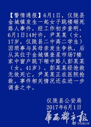 高二女生与母亲争执后从7楼跳下 砸死过路行人_北京时间
