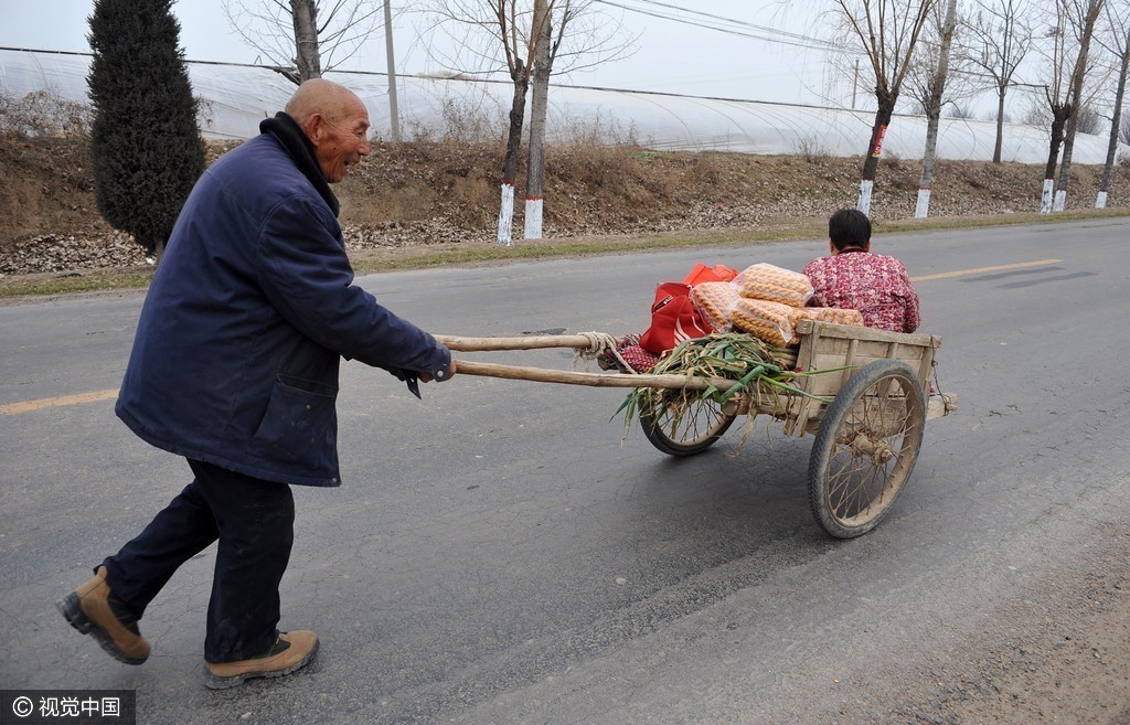 2017年1月15日,山西永济,在赶集归来的人流中,李大爷用架子车推着老伴走在回家的马路上。