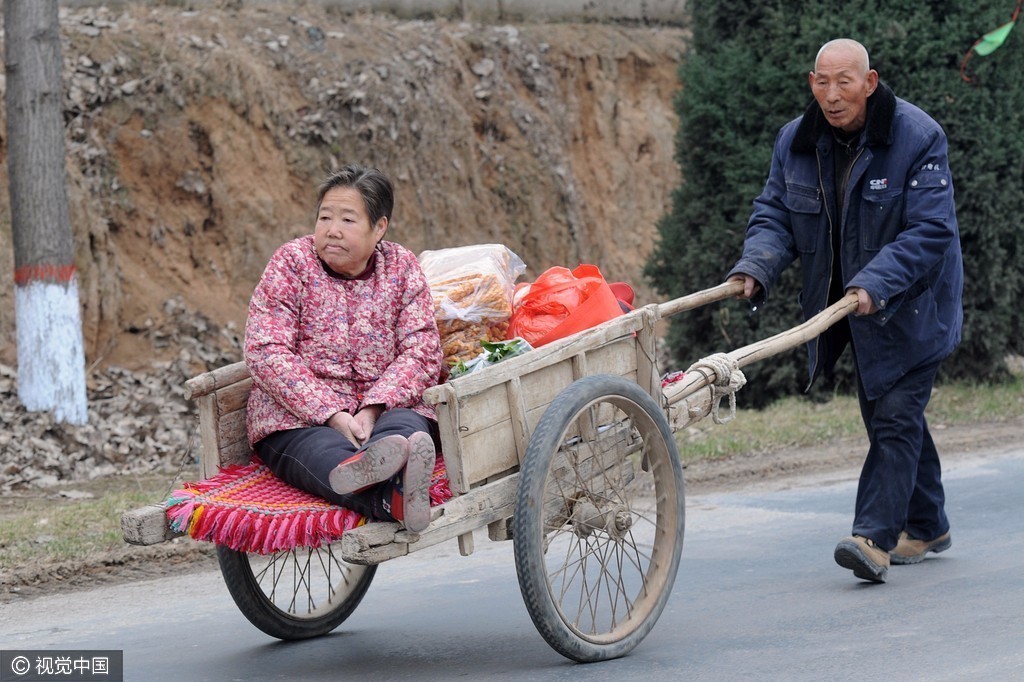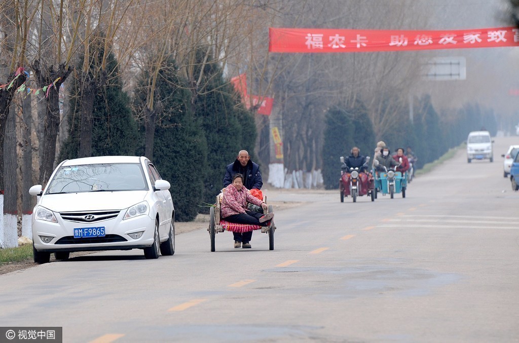 2017年1月15日,山西永济,在赶集归来的人流中,李大爷用架子车推着老伴走在回家的马路上。