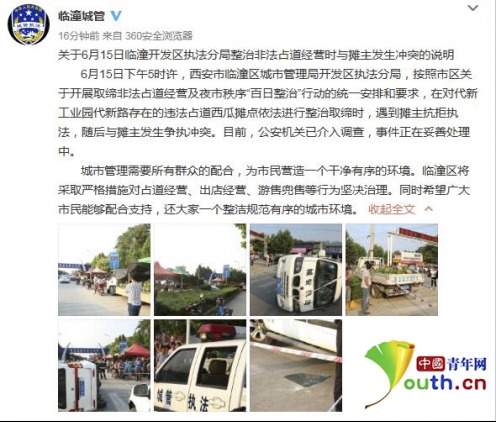 6月15日,西安临潼开发区执法分局城管队员在针对一起西瓜摊占道经营整治取缔时遭遇摊主抗拒执法,双方产生争执后发生肢体冲突,一执法车辆被掀翻。