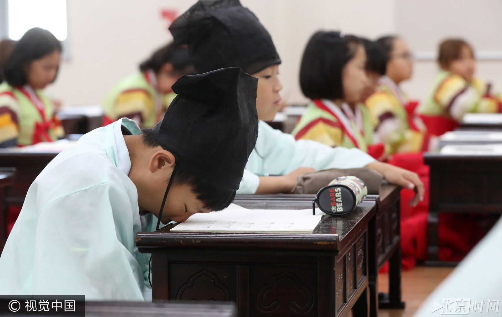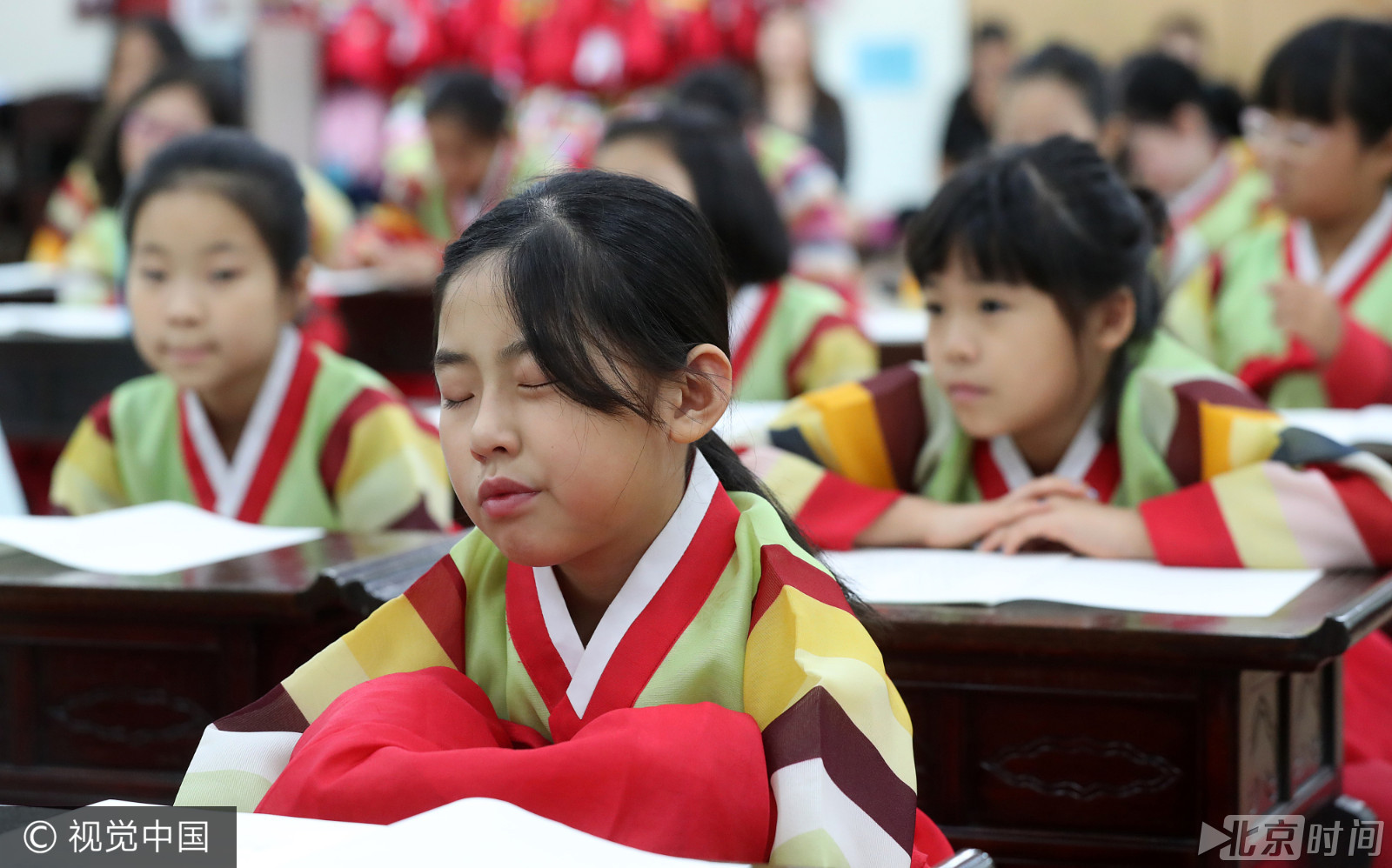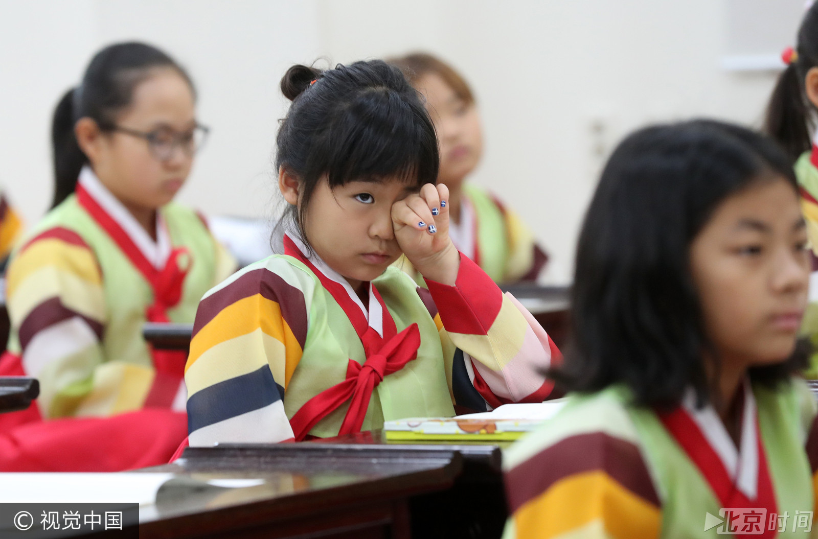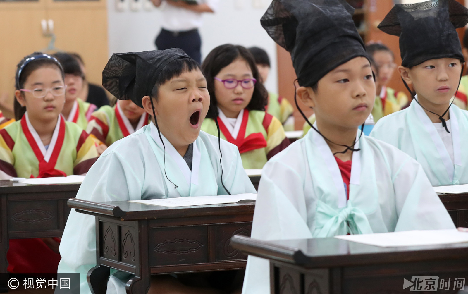 当地时间2017年7月26日,韩国釜山,孩子们身穿韩服参加“小学生传统文化体验课”。