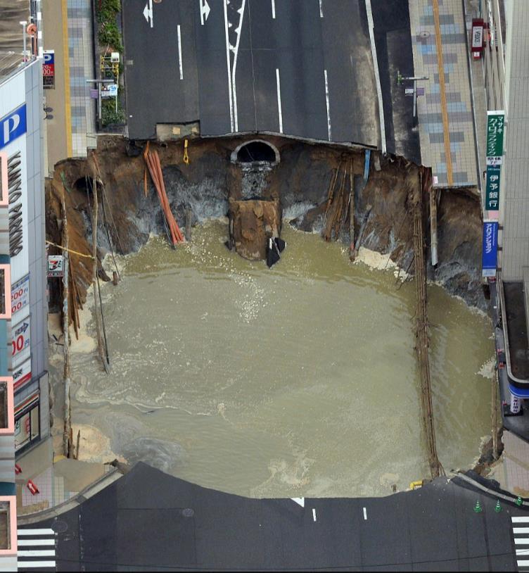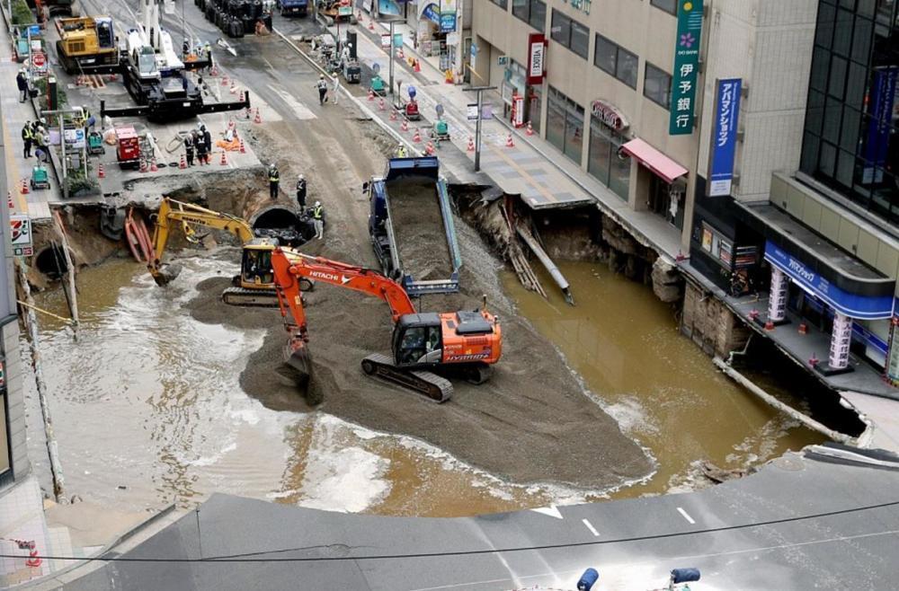 因此,福冈市市长也再次在社交媒体上发文道歉,表示了对没能提前发布警告、提醒市民塌陷可能性的歉意。图为第一次塌陷的深坑,导致了城市管道破裂。