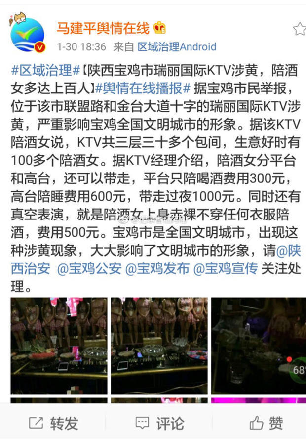 市民举报,位于宝鸡市联盟路和金台大道十字的瑞丽国际KTV有特服项目,严重影响宝鸡全国文明城市的形象。