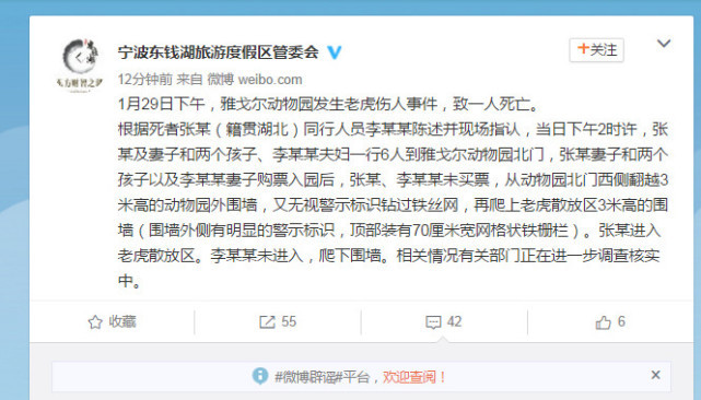 1月29日下午,雅戈尔动物园发生老虎伤人事件,致一人死亡。