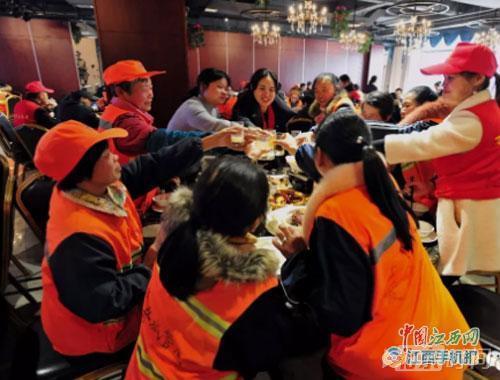 2月2日,在万载县尊味尚品音乐餐厅,好爱超市董事长刘芬宴请了来自县城的397位环卫工人,提前感受2018年春节的年味。