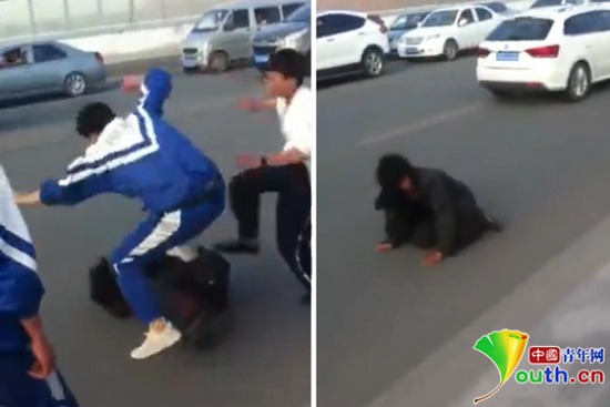 一乞丐因不明原因遭到学生殴打,来往车辆很多十分危险。这些学生边打边辱骂乞丐,并录下视频发到空间炫耀。
