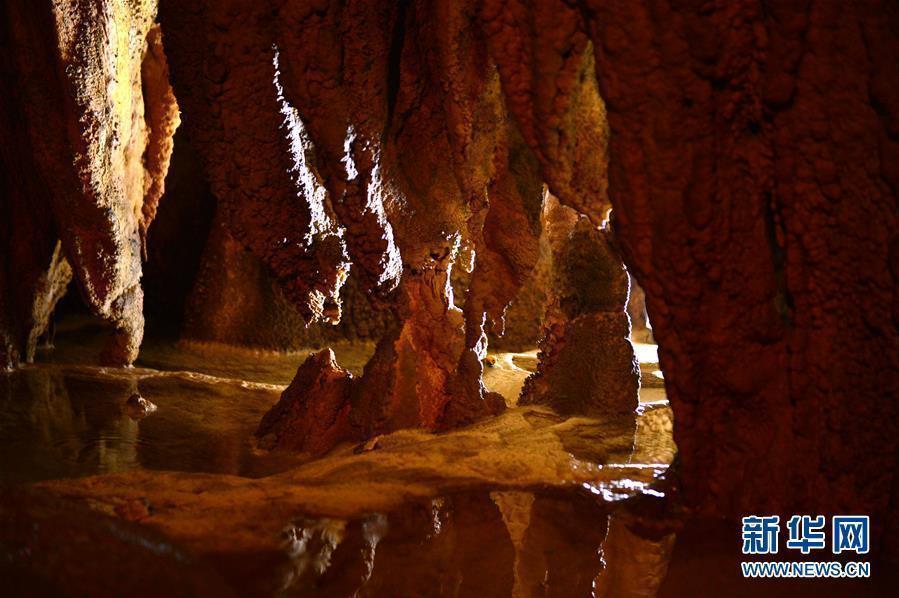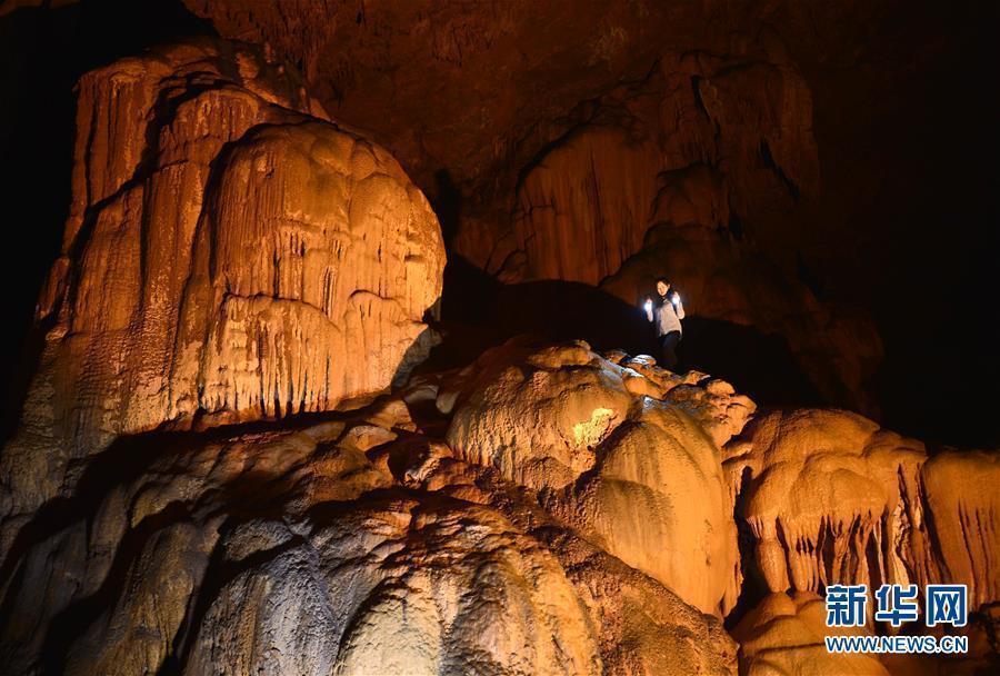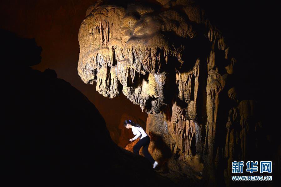 5月25日,一名女孩在湖北省宣恩县锣圈岩的地下溶洞里游玩。