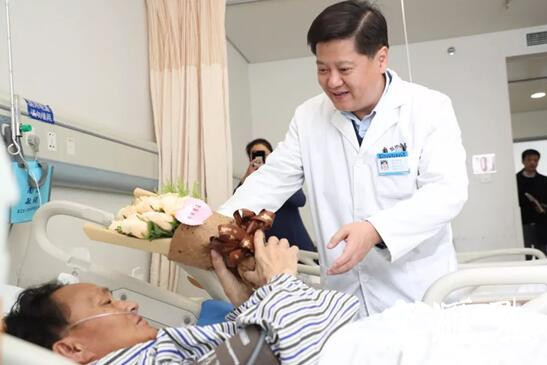 2月25日上午,江苏省南京市鼓楼医院肝脏移植中心的医护人员正将51岁妻子的一半肝脏取出,移植到丈夫体内……3月5日上午,院领导向夫妻献上鲜花。