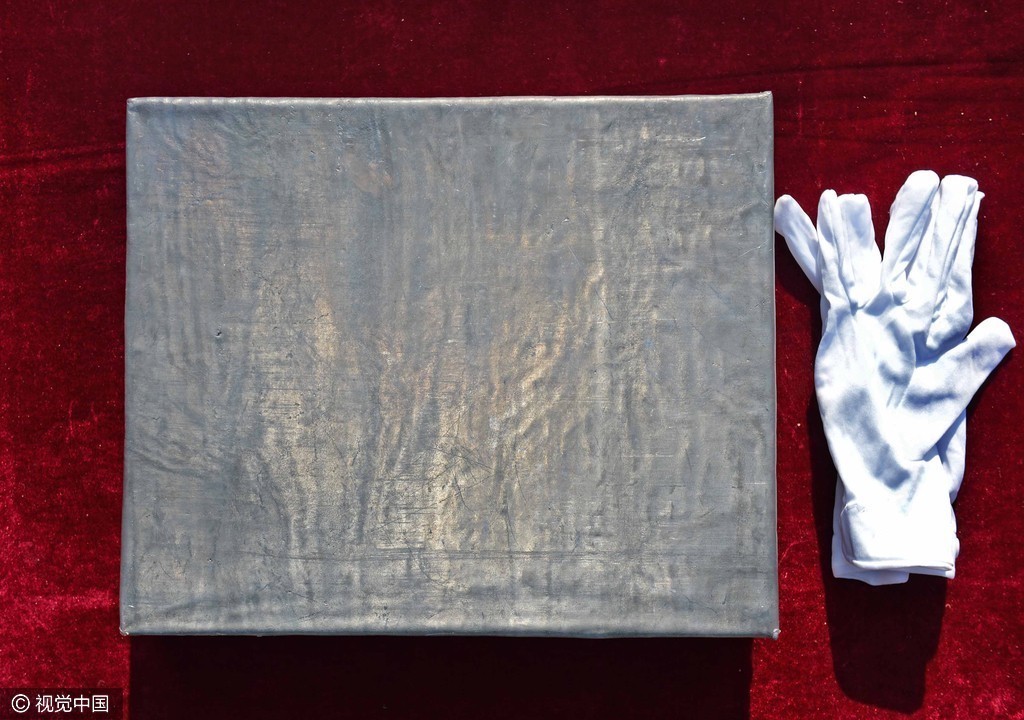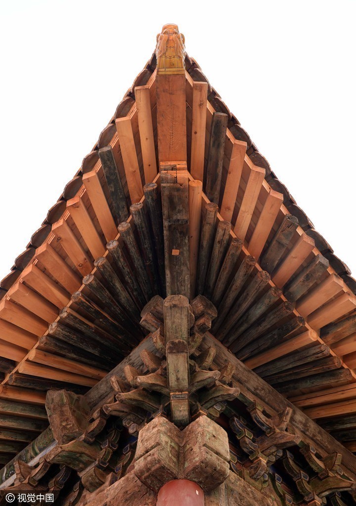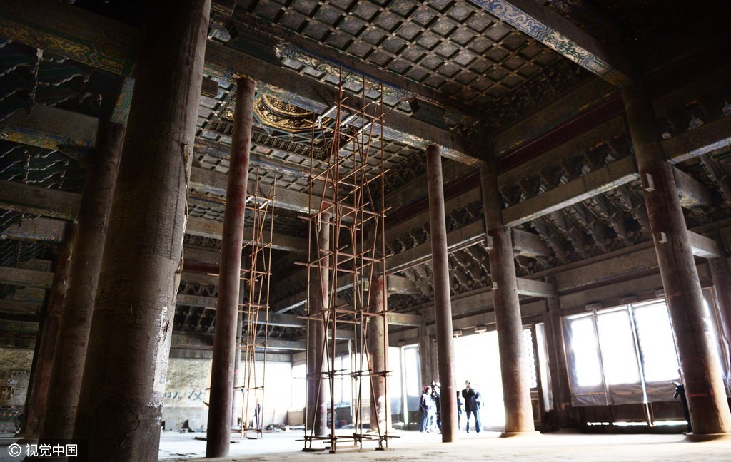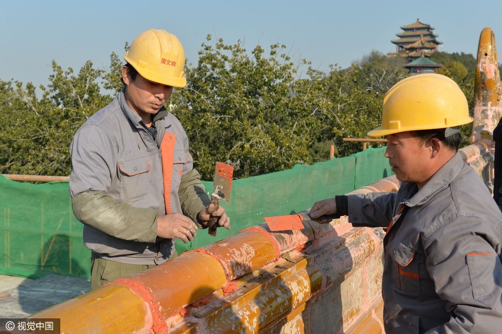 故宫博物院工作人员将施工前拆卸下的宝匣小心翼翼地重新安放到大殿正脊正中的脊筒中,并完成正脊合龙。