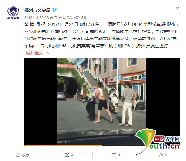 视频中,一赤裸上身的男子两次击打交警面部,导致交警警帽掉落。21日晚,湖南省郴州市公安局发布通报称,一交警在制止两车司乘人员冲突时被殴打。