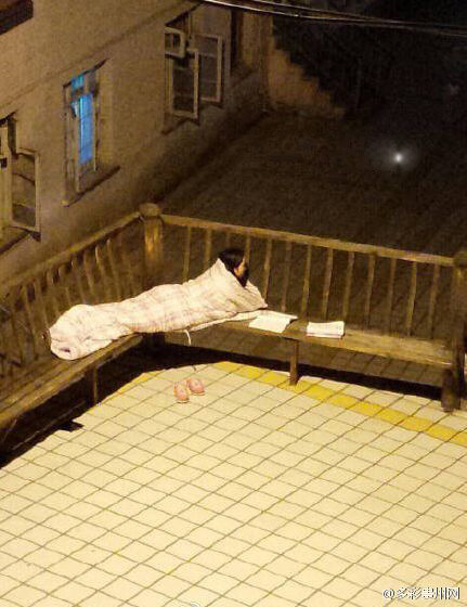 学霸的世界,我们不懂!贵州省人民医院护士学校的一名女学生裹着厚厚的棉被,借着路灯看书学习。