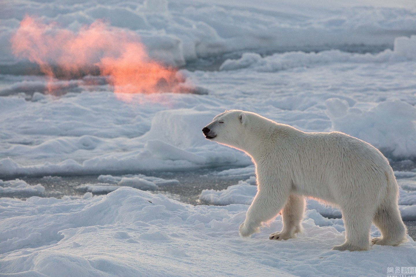 2015年12月31日消息(具体拍摄时间不详),北极,一只北极熊呼出的热气在阳光的照耀下像是吞吐出火焰。来自美国加州的摄影师Josh Anon在距离北极熊15米的地方拍下了这有趣的一幕。