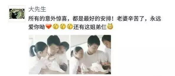 5月时小儿子出生,佟大为在朋友圈中写到:“所有的意外惊喜,都是最好的安排!老婆辛苦了,永远爱你呦,还有这姐弟仨。”佟大为还配了两张照片,爸爸怀抱小儿子,慈祥的目光注视在儿子的脸上,两个女儿环绕在爸爸身旁,欣喜和幸福的看着家庭新成员。妈妈关悦也感慨说“所有的意外惊喜,都是最好的安排!”