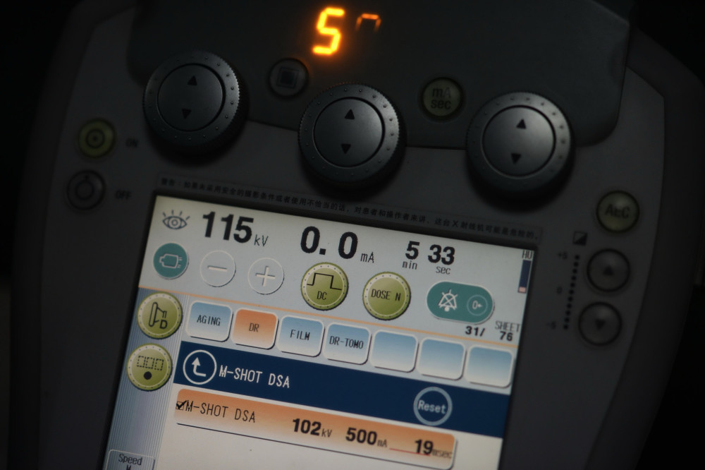 一台小手术下来,显示屏里显示刘亚在X光辐射下工作了5分33秒。
