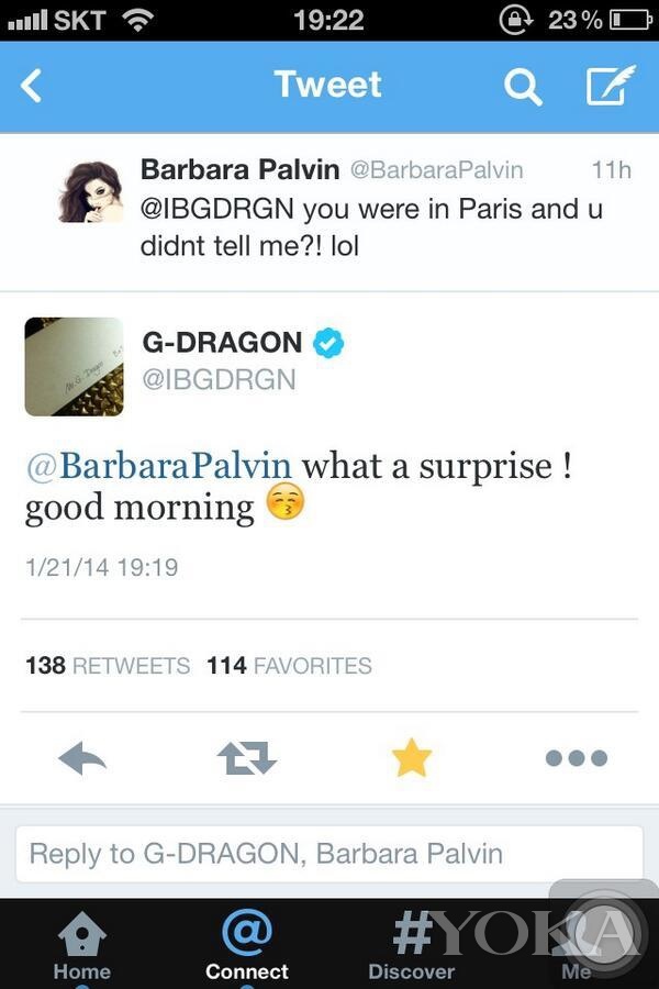 没想到,没过多久,她就真的和权志龙互粉了呢!权志龙还主动给她的照片点赞!简直就是“粉生”赢家有木有?后来有一次权志龙来了巴黎,Barbara Palvin更是直接大胆粗暴的在网上说:你咋来了都不找我呢?没想到高冷GD还回应了……