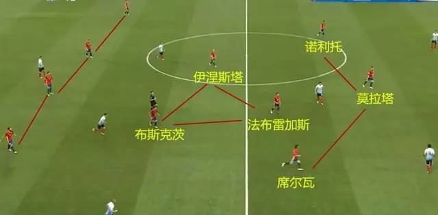 本场西班牙虽然人员阵型都没变,但是让上场略微酱油的小法位置前提,在进攻中扮演更为重要的角色,一举激活了另一侧的诺利托,并最终带活了西班牙的整个进攻。这样的战术变化,你看懂了么?