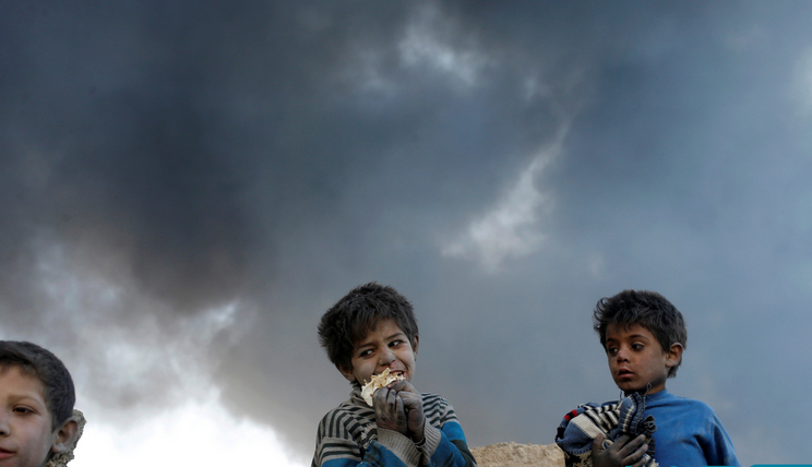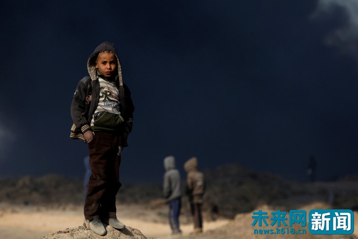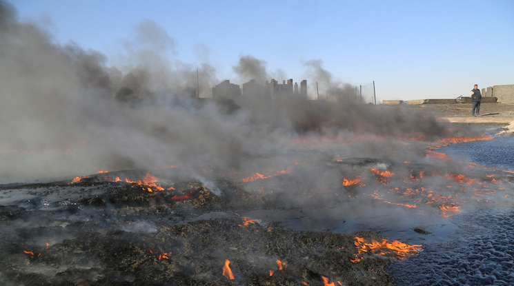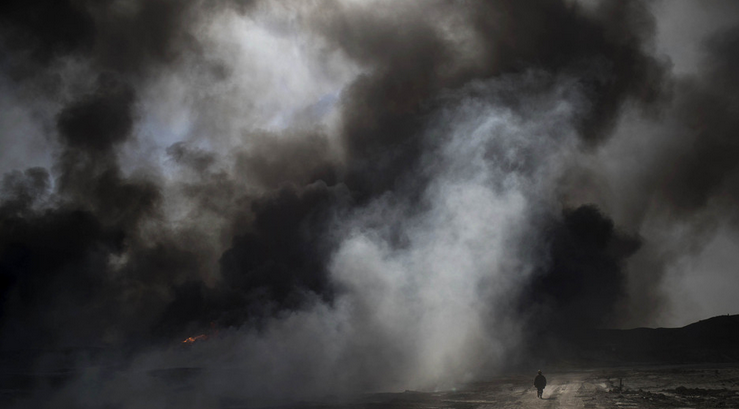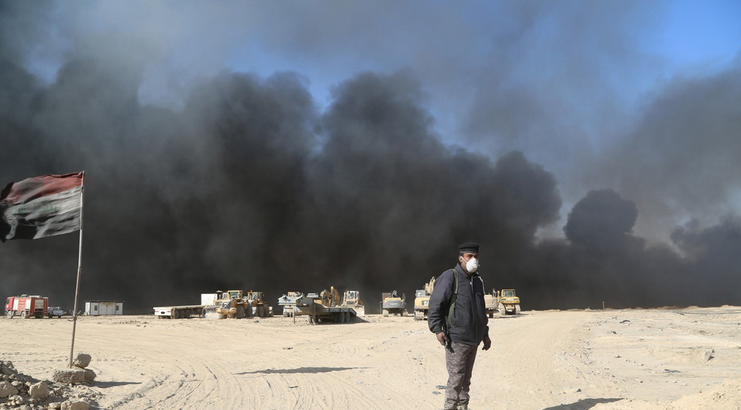 当地时间2016年11月22日,伊拉克摩苏尔南部Qayara,伊拉克军队与极端组织伊斯兰国激战正酣,极端组织放火焚烧油田,现场浓烟滚滚。