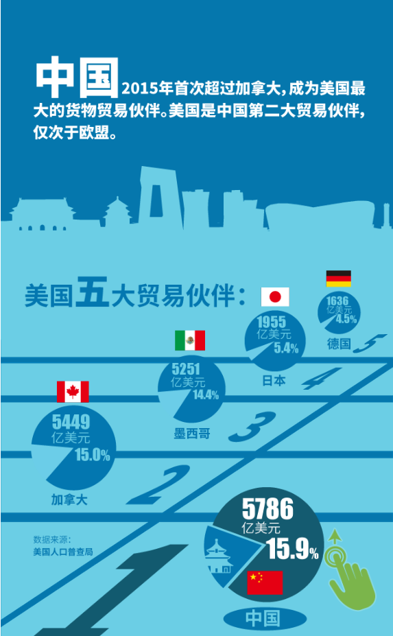 中国2015年首次超过加拿大,成为美国最大的货物贸易伙伴。