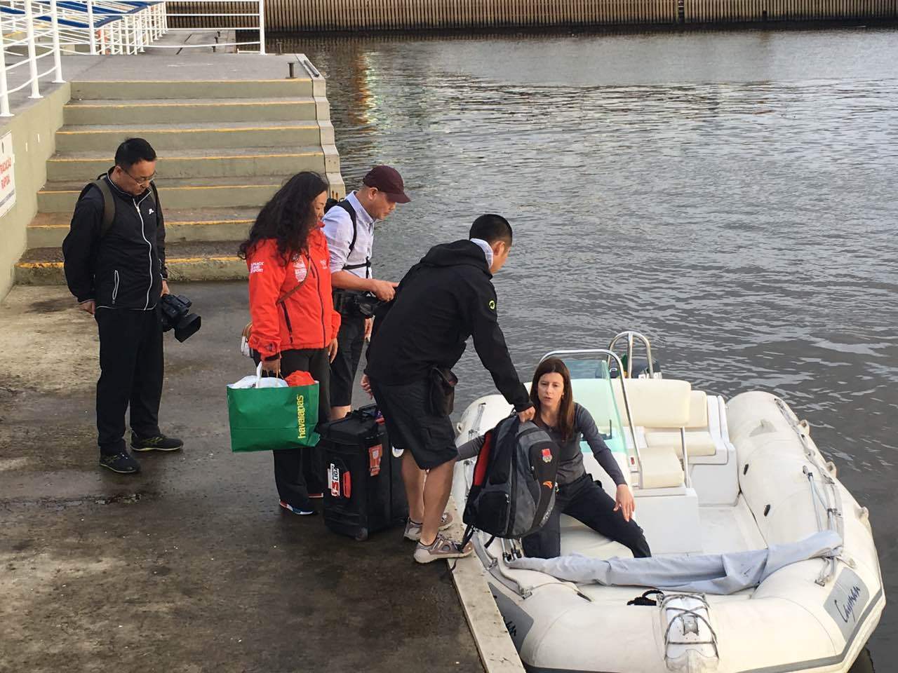 这是第一批上船出发的媒体,他们正在检查设备是否完好。