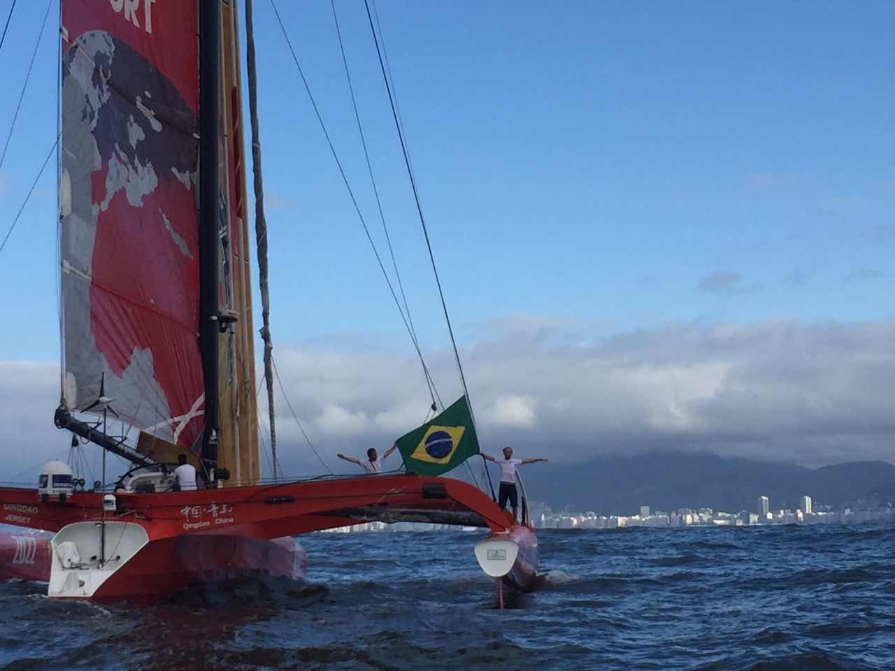 “北京时间2022号”终于抵达巴西,郭川船长往船上挂巴西国旗,船员们一起欢呼着。