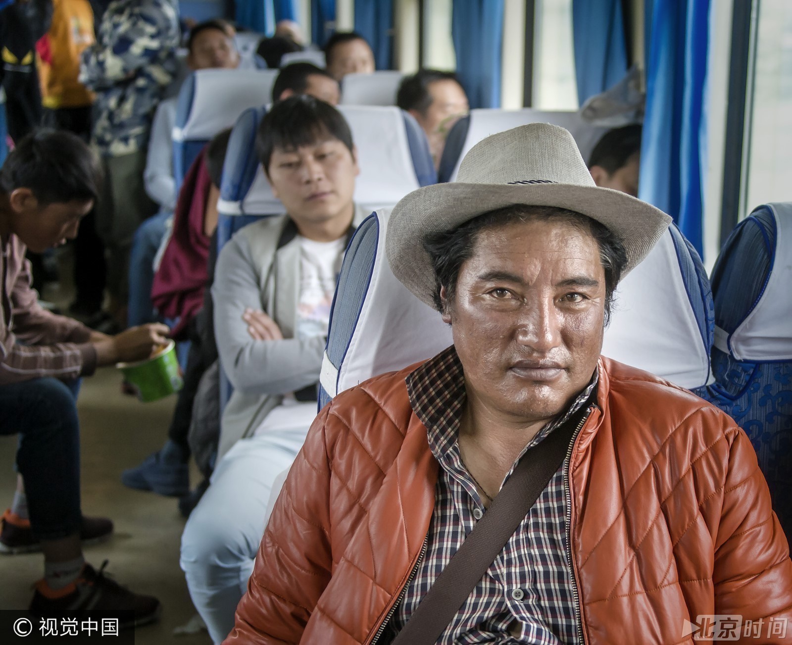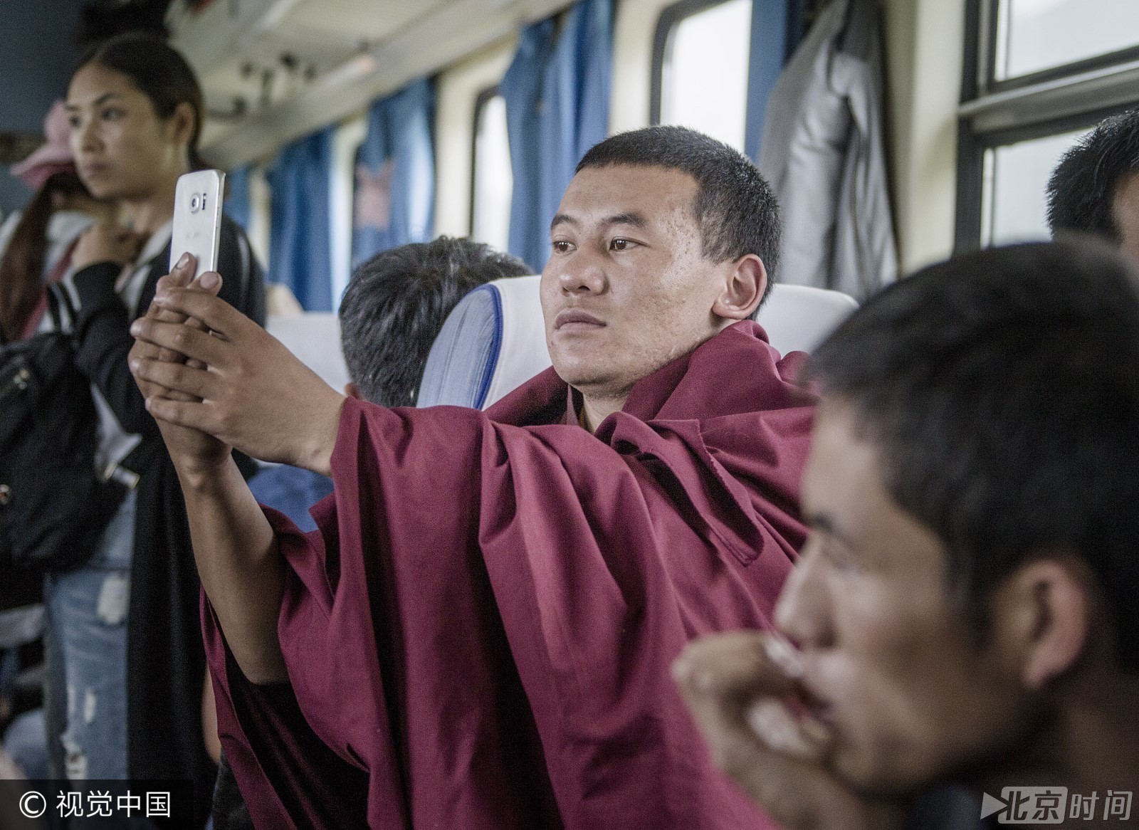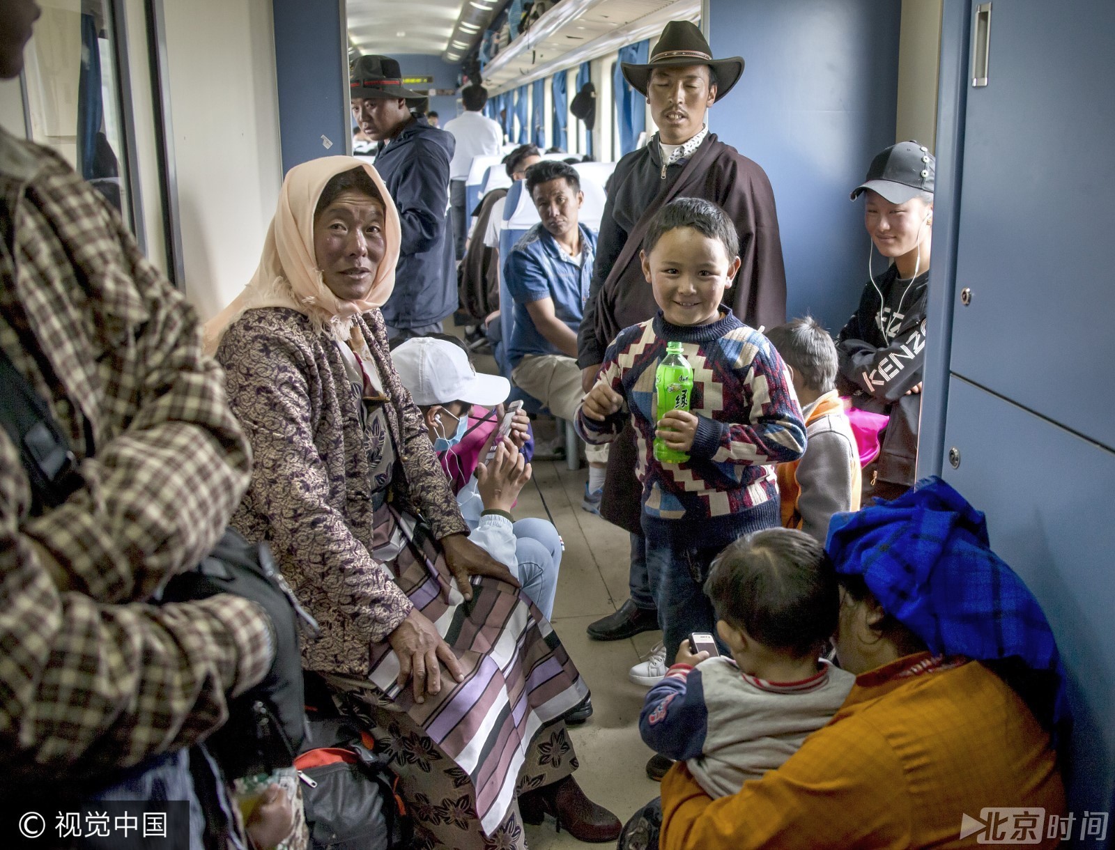 2017年8月9日,青藏铁路沿线,参加2017年国家级非物质文化遗产“当吉仁”赛马节活动后,人们专程乘坐青藏铁路-Z6801次绿皮火车