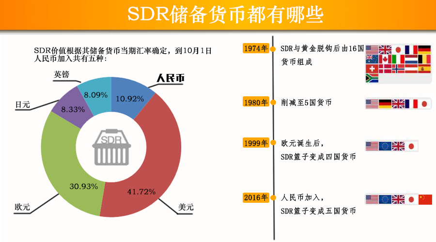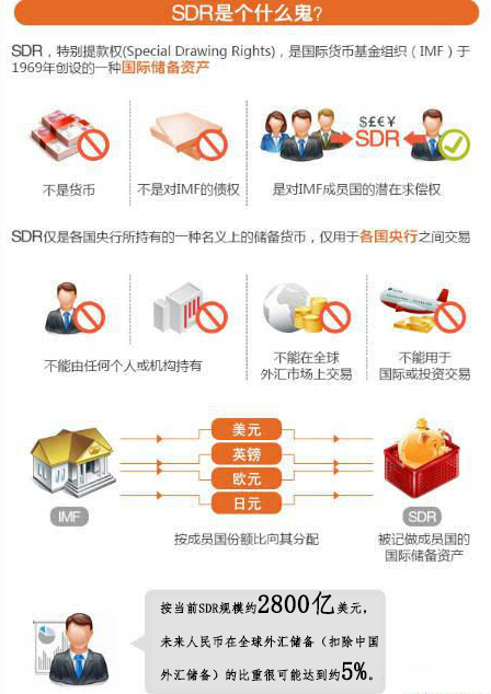SDR是IMF于1969年创设的一种国际储备资产,用以弥补成员国官方储备不足,其价值目前由美元、欧元、日元和英镑组成的一篮子储备货币决定。