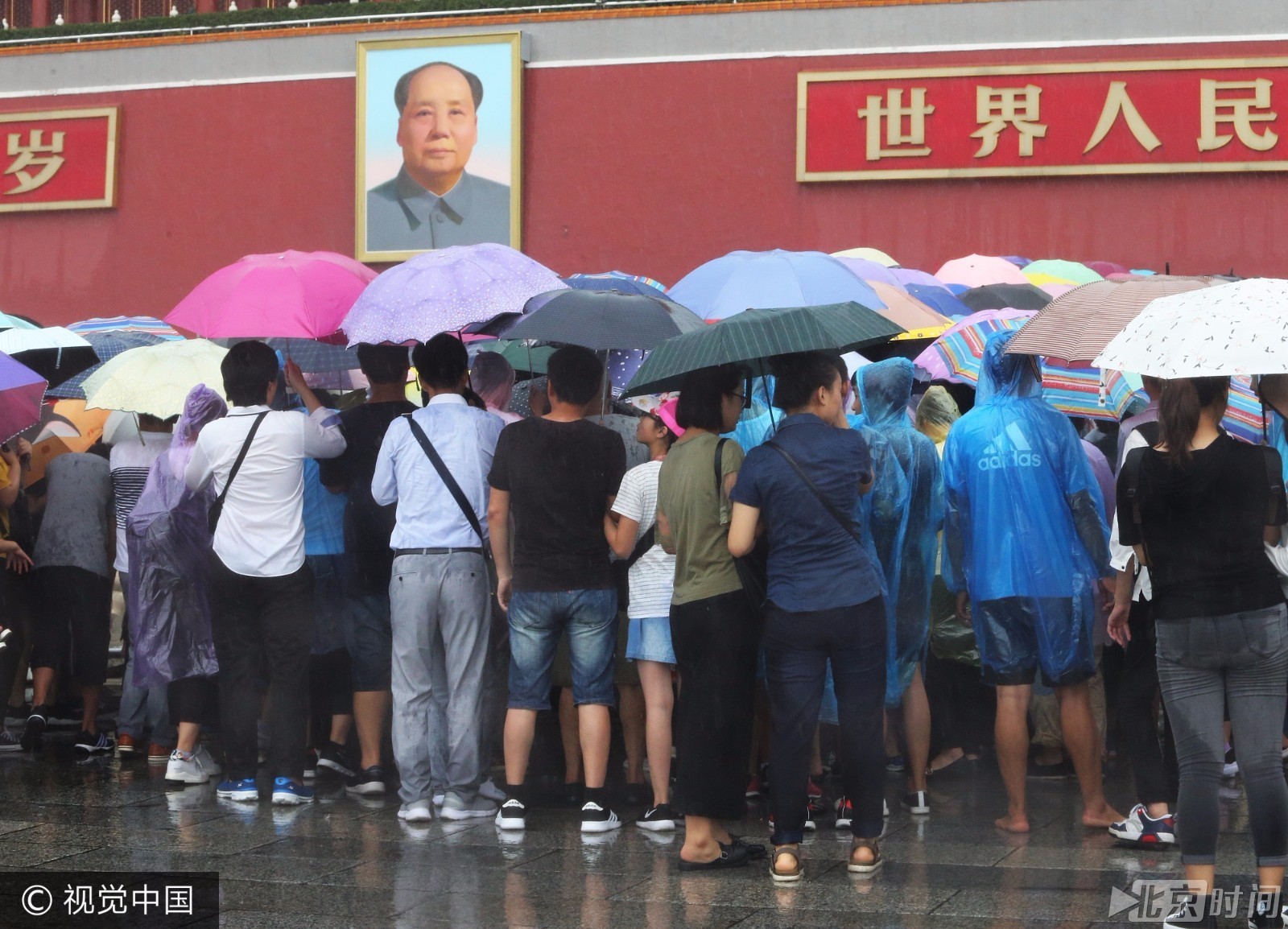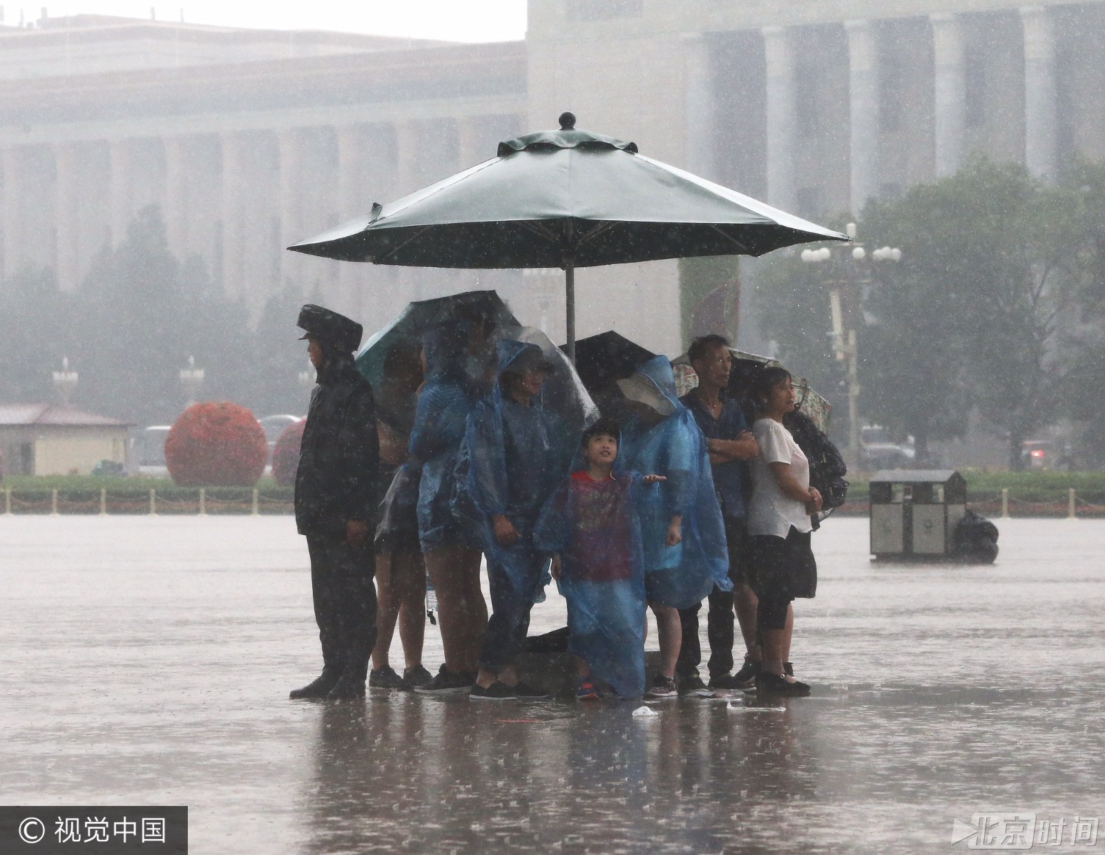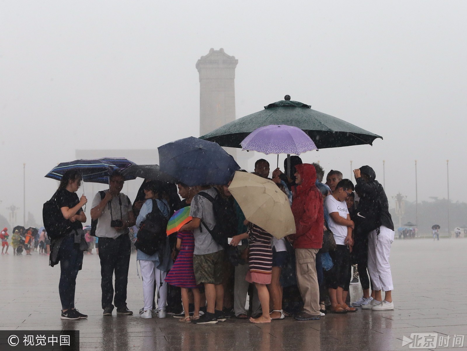 北京,游客冒雨游览天安门广场。当天北京遭遇暴雨天气,北京气象台拉响暴雨蓝色预警信号,提醒市民外出做好防范措施。