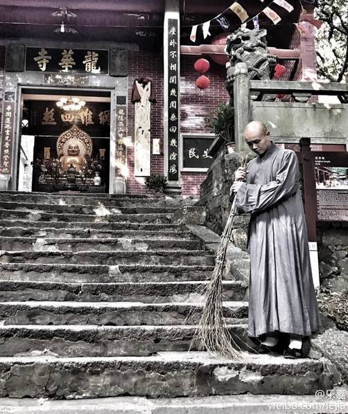 2月12日,乐嘉在微博上晒出两张自己变身扫地僧人的照片,只配文一个“扫”字。照片中的乐嘉身处寺庙。