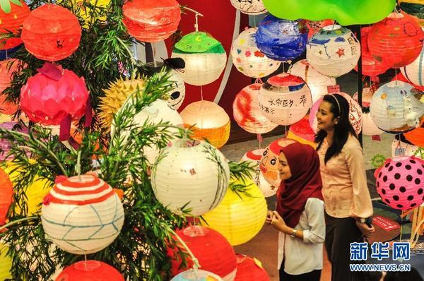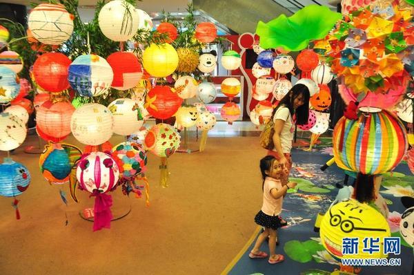 在马来西亚吉隆坡的一家商场,游客观赏灯笼。当天,马来西亚吉隆坡一家商场举办一场灯笼制作比赛,把上百个参赛作品在商场内展示,提前营造中秋氛围,让游客欢喜过节。