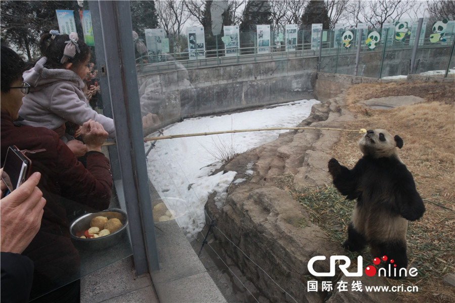 2月19日农历戊戌狗年正月初四,在山东省威海市刘公岛景区内,大熊猫“竹灵”和“宁宁”正在欢度它们到威海后的第八个春节。这一天,它们迎来了一批专程来陪它们过年的贵客。