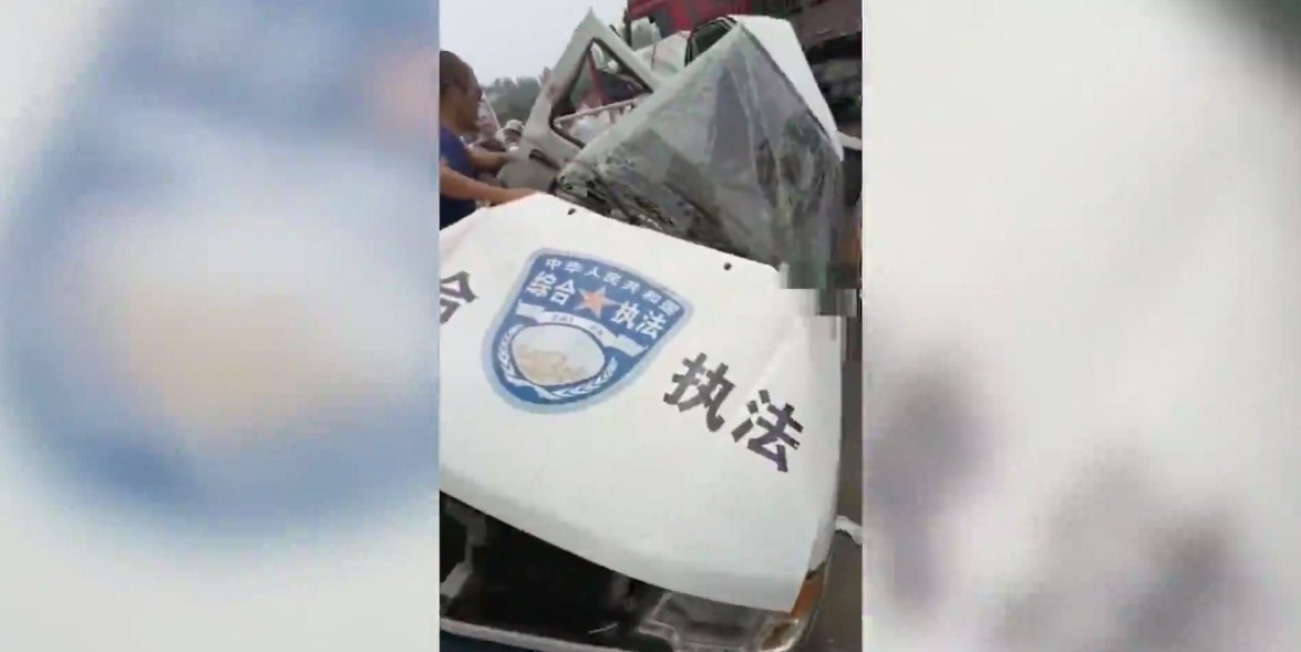 6月23日,网上出现一段30秒的视频,一辆豫Q牌照的城管执法车停在路边,车辆严重变形,驾驶员满身是血倒在车门上。