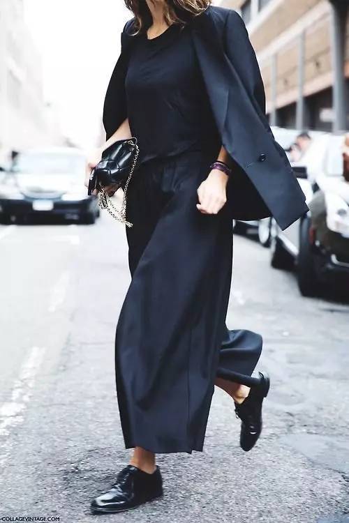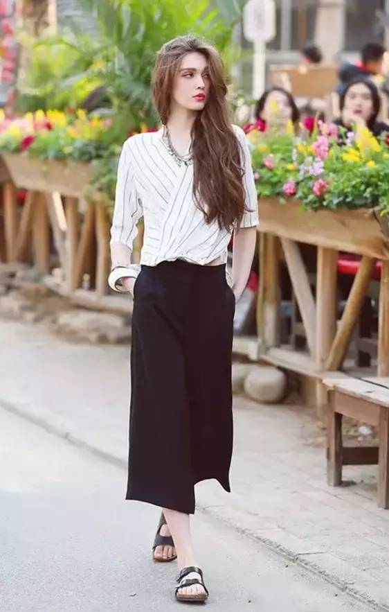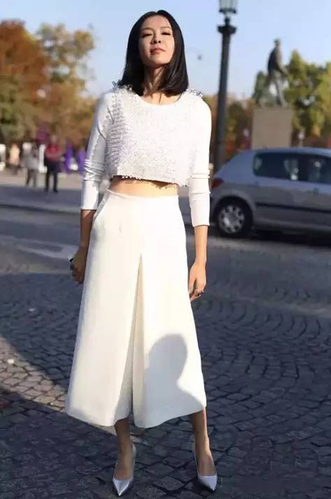 简约的白色上衣搭配黑色高腰阔腿裤,如此逆天的好比例可全是阔腿裤的功劳哦。
