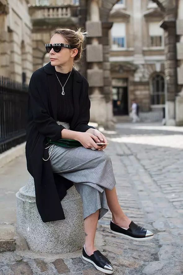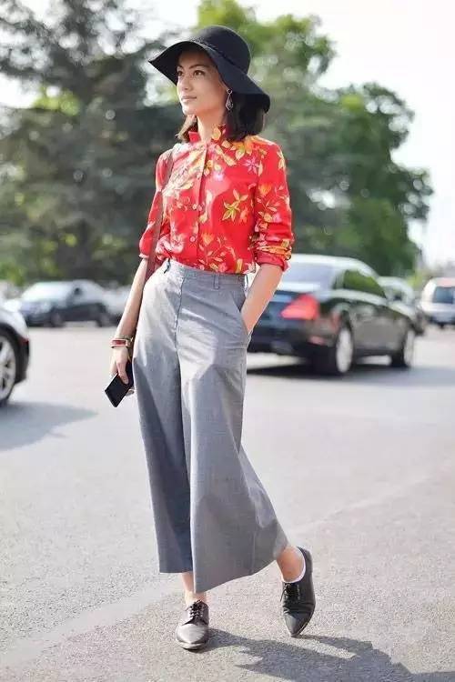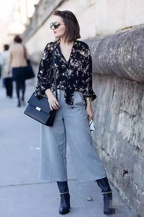 印花衬衫搭配灰色高腰阔腿裤,七分长度更加利落,搭配黑色靴子经典不出错。
