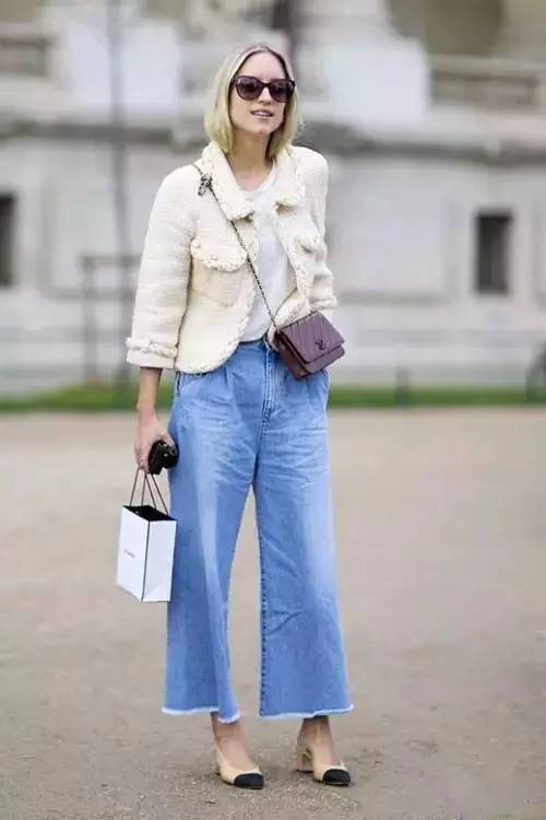 九分牛仔阔腿裤很适合清新的春天,搭配白色短款小外套和白T恤,显着拉长了比例,搭配经典链条包和双色鞋,简约不失精致。
