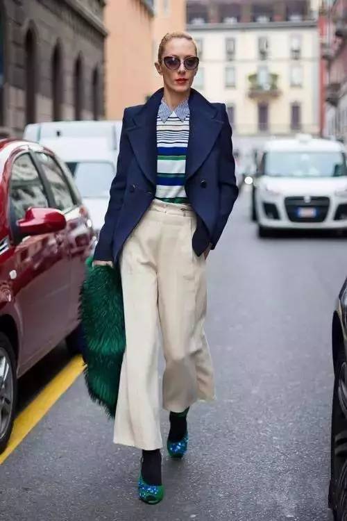 藏蓝色小西装配条纹衫和米色阔腿裤,十分知性潇洒,鞋子和内搭的颜色一致,细节完美呼应。