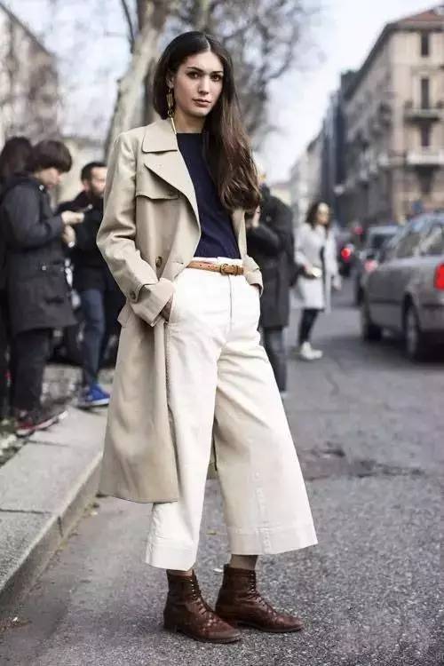 经典的卡其色风衣配深色T恤和米色阔腿裤,这身造型的败笔是用长款风衣搭配了平底鞋,显得比例有些奇怪。