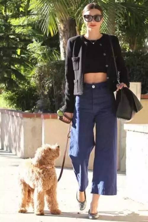 黑色短款外套配露脐上衣和深蓝色高腰阔腿裤,同样是短款上衣配高腰裤,记住这个穿阔腿裤的小技巧哦。