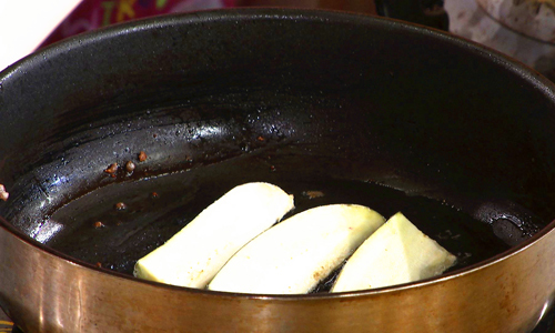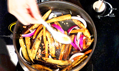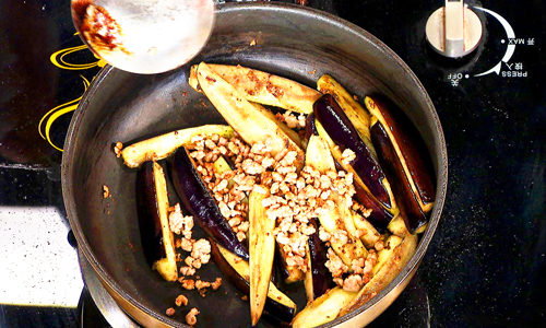 步骤3:放入茄子,煸炒至金黄,放入牛肉馅。