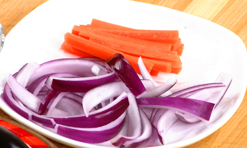 步骤1:茄子、胡萝卜、洋葱切条。