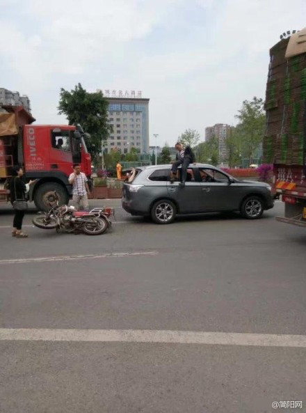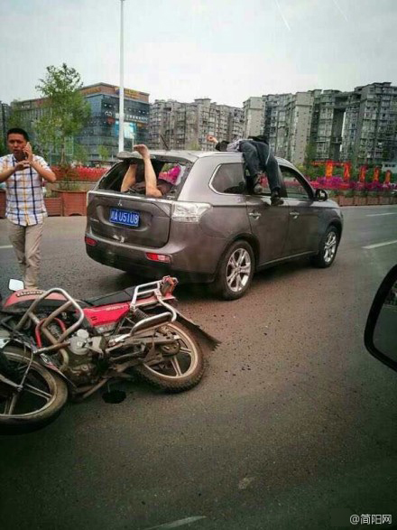 一辆摩托车追尾一辆小车,摩托车上的两名乘客一人“钻”进了小车后备箱,一人“飞”上了小车车顶。