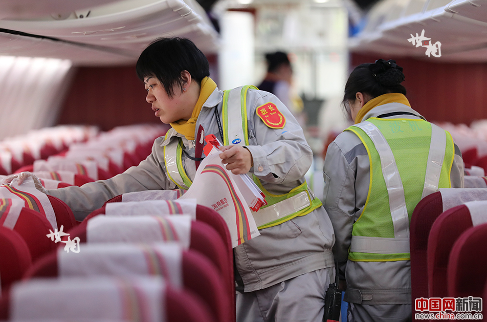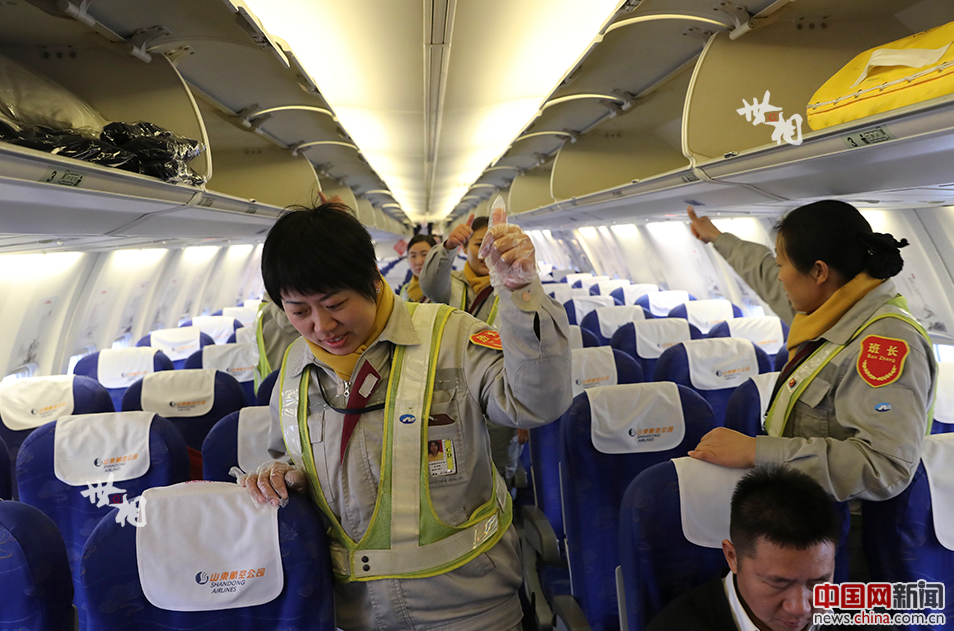 机场地服保洁部向日葵班组,春运期间每天要负责80余架次进港航班的客舱保洁。按照每架飞机180个座位计算,一天下来她们要保洁上万个座位,垃圾清运量比平时多了7-8倍。